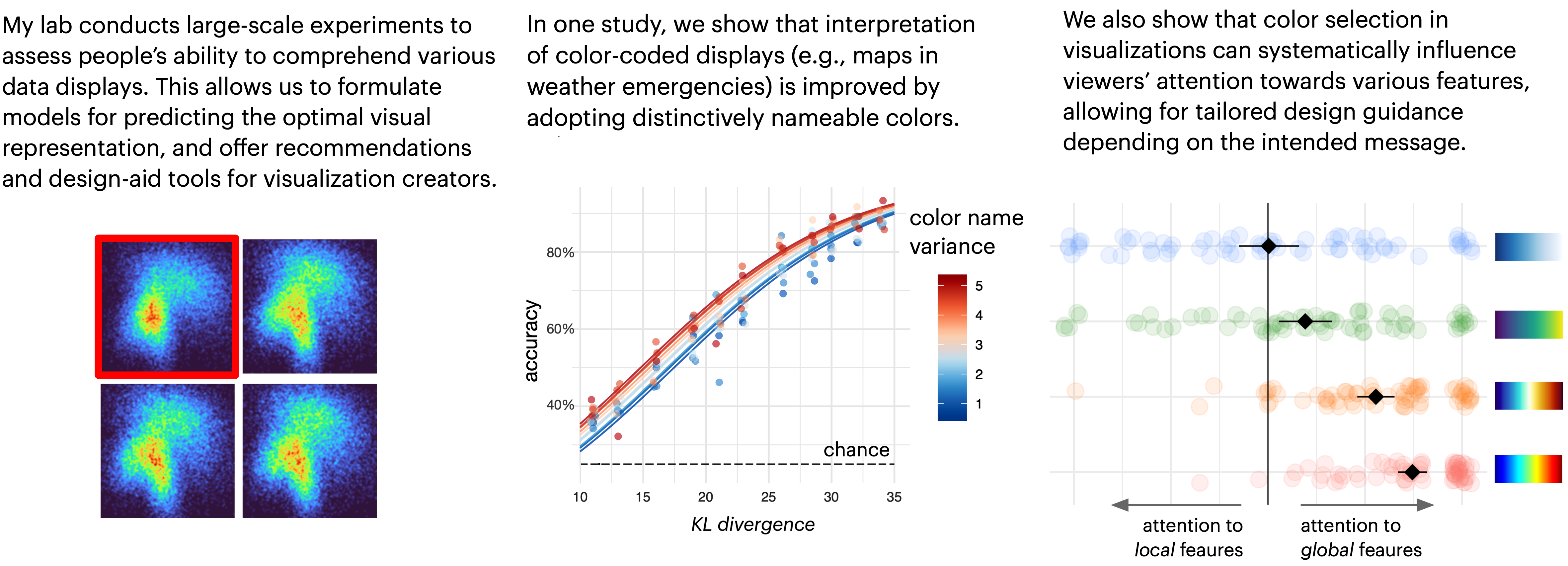 For example, in a series of experiments, we explored the influence of color choice on people's ability to read maps, such as those used for public communication during weather emergencies. We found a strong correlation between the nameability of colors used in the display and viewers' ability to interpret these maps. Specifically, visualizations incorporating distinctively nameable colors appeared to be more easily interpretable (VIS '21 paper). In subsequent work, we also demonstrated how seemingly inconspicuous color selections can bias viewers, causing them to focus on specific data features within the visualization while potentially overlooking others (TVCG '23 paper).